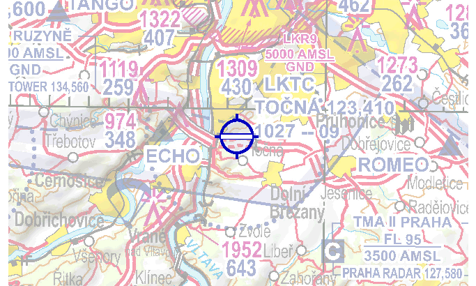 Mapa uvádí nadmořské výšky zajišťující výšku nejméně 300 m (1000 ft) nad překážkami v okruhu 5 NM od letadla.