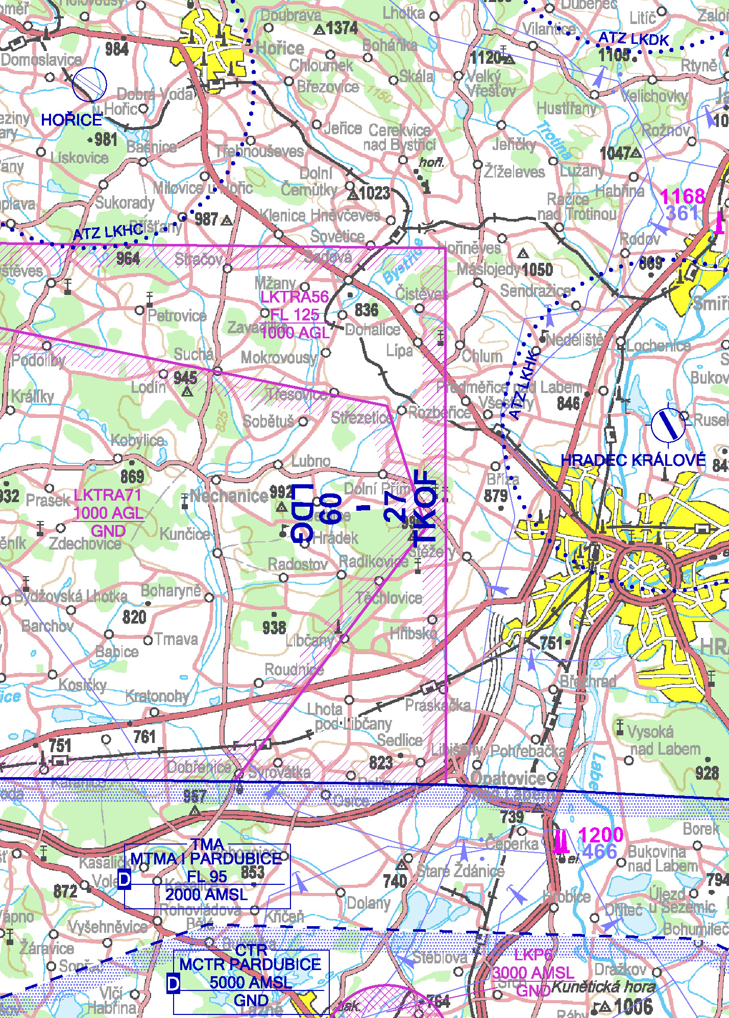 3.1Private, unidirectional sport flying equipment field. 100 m S forest. 530 m W of RWY THR tree. The field is located in LKTRA71 Smidary (GND - 1000 ft / 300 m AGL), and below LKTRA56 Nový Bydžov (1000 ft / 300 m AGL - FL 125).