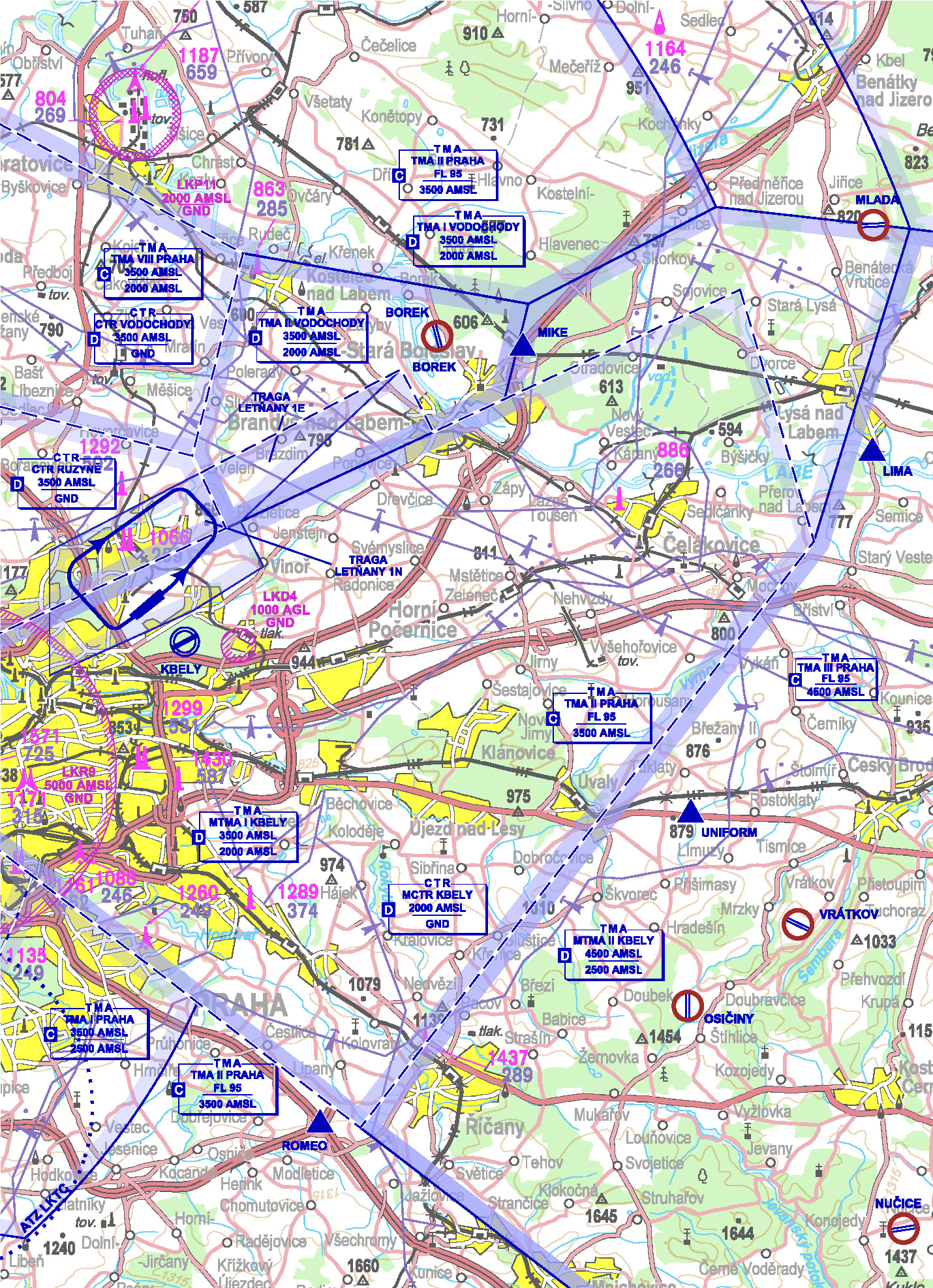 1.3.1.4Trajektorie přímých letů přes body LIMA, UNIFORM, ROMEO podléhá letovému povolení vydanému MTWR Kbely.
