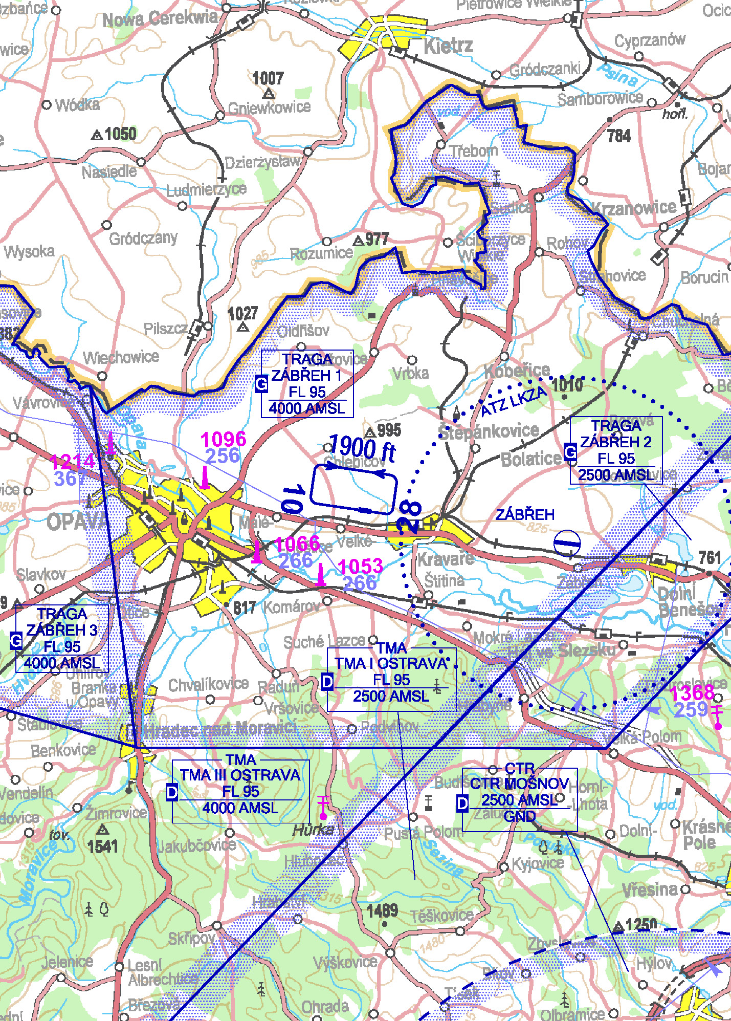 3.1Při N větru turbulence za hangárem. Plocha SLZ leží pod TMA III Ostrava. Nelétat nad Velké Hoštice a Kravaře v menší výšce než 1000 ft / 300 m AGL.